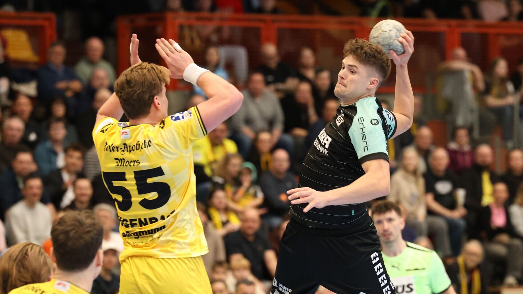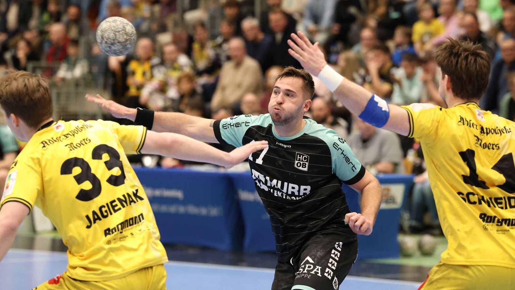 In der ersten Halbzeit sahen 1330 Zuschauer eine ausgeglichene Begegnung. Weil die Schiedsrichter den Gastgebern in der Anfangsphase sehr viele Siebenmeter zusprach und der frühere Fürstenfeldbrucker Falk Kolodziej diese zu Treffern für die HSG nutzte, lagen die Gastgeber meist knapp vorn. Der HCOB fand aber nach kurzer Anlaufphase besser ins Spiel. Es gelang immer wieder, den wurfgewaltigen Rückraumschützen Malte Dederding in Szene zu setzen. So gelang es, wieder heranzukommen. In der 22. Minute warf Timm Buck den Ball aus 25 Metern ins verwaiste Tor und sorgte damit für den Gleichstand (12:12). Der HCOB hatte in dieser Phase wiederholt die Gelegenheit, in Führung zu gehen. Einmal war’s Pech, ein weiterer Distanzwurf von Työrvi Tyr Gislason ging an den Pfosten, dann beraubten sich die HCOB-Akteure mit technischen Fehlern der Chance zur Führung. Die HSG Krefeld Niederrhein machte das den entscheidenden Tick cleverer – und Trainer Mark Schmetz brachte mit Lukas Schneider den richtigen Mann aufs Feld. Dieser sorgte mit den letzten beiden Toren vor der Pause für die 16:14-Führung der Hausherren.