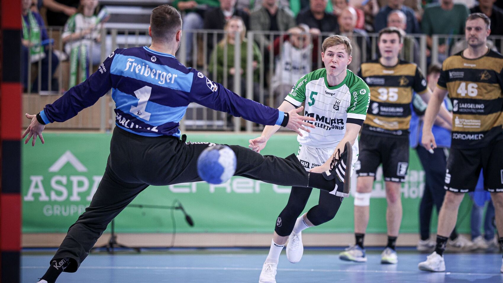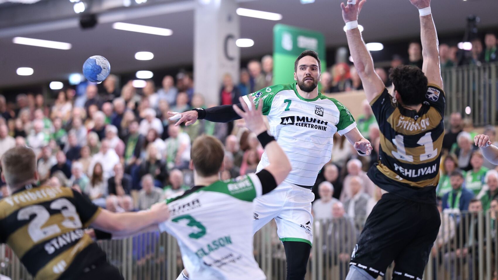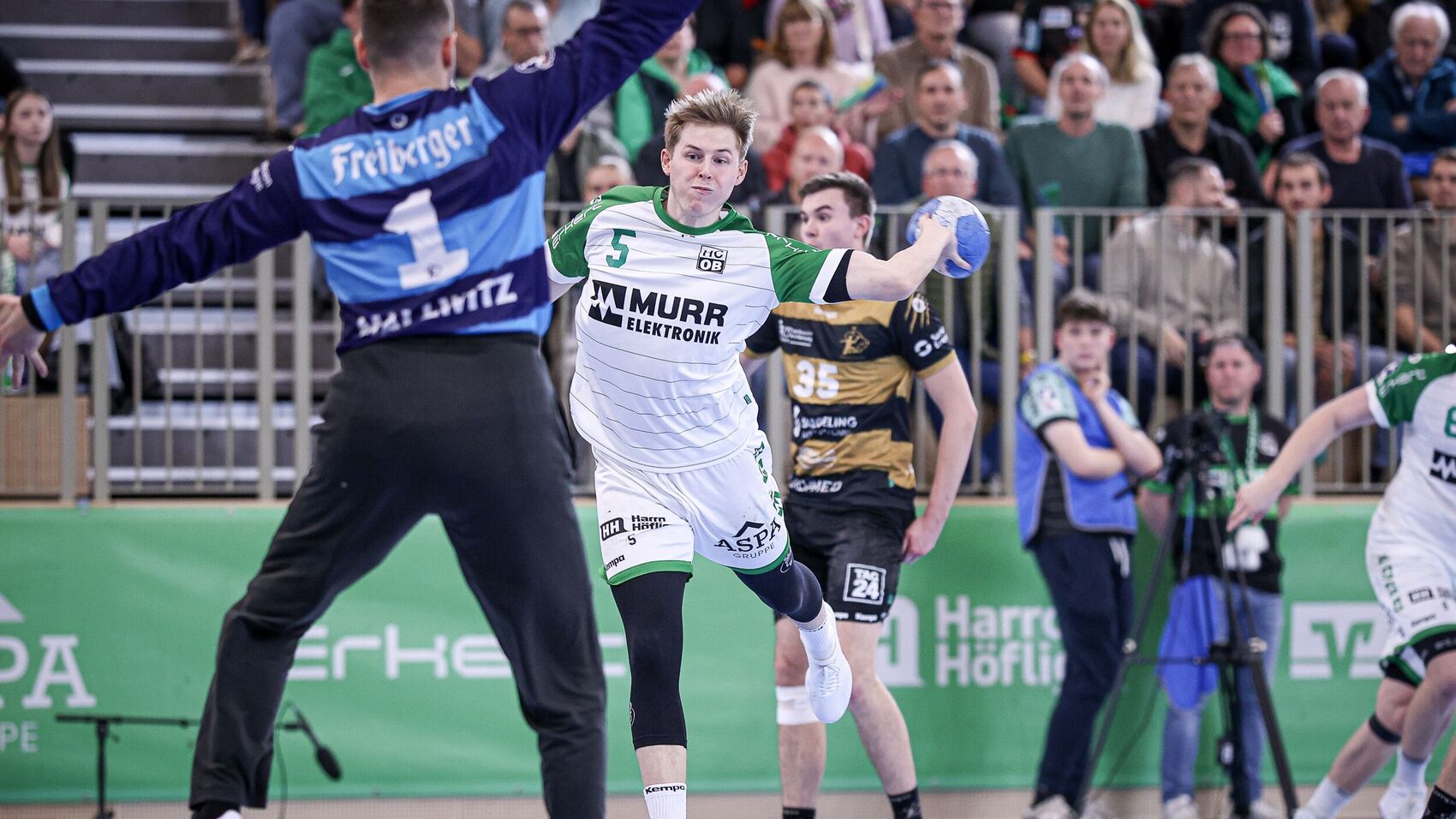 Die Partie stand nun Spitz auf Knopf. HCOB-Linkshänder Malte Dederding setzte mehrere Bälle aus der zweiten Reihe in die Maschen. Die Dresdner verließen sich auf ihre individuellen Stärken. Vor allem Sebastian Greß setzte sich oft entschlossen durch. Dann kam der Moment, in dem die Partie zugunsten des HCOB hätte kippen können. Zunächst hielt der eingewechselte Torwart Janis Boieck einen Wurf, dann erzielte Cedric Mayer einen Treffer zur Führung und schließlich legte Kreisläufer Työrvir Týr Gislason per Konter nach. 32:30, die Halle stand Kopf, und es waren nur noch dreieinhalb Minuten auf der Uhr.
