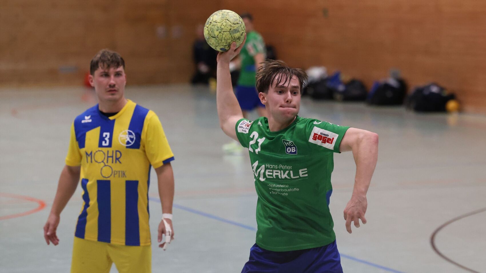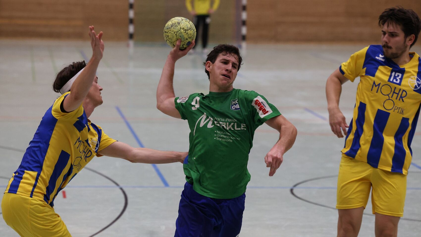 In der Anfangsphase taten sich die Gastgeber schwer, weil sie gute Chancen ausließen, Siebenmeter nicht zu Toren nutzten und beim Gegenstoßspiel ungenau agierten. Die Tübinger waren in der Verwertung zunächst besser und lagen deshalb mehrmals vorn, zweimal sogar mit drei Toren Vorsprung. Der HCOB fing sich aber zunehmend und glich in der 22. Minute durch Johannes Csauth zum 8:8 aus. Entscheidend für den Aufwärtstrend war, dass die Abwehr immer besser funktionierte. Torwart David Lindenlaub sammelte einige Paraden. Beim Seitenwechsel lag die Heimmannschaft schon mit 14:11 in Führung.